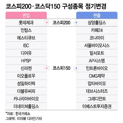 이번 정기변경에서 코스피200 기존 종목 중 삼양홀딩스가 편출되고 롯데제과가 신규 편입된다. 롯데제과는 지난 7월 롯데푸드를 흡수합병해 재상장했다. 시가총액 규모가 합병 전 7000억원 규모에서 합병 후 1조원대로 크게 늘었다.
