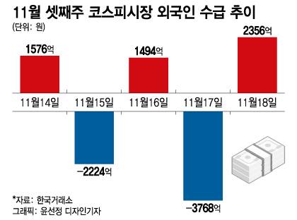이처럼 외국인이 유가증권시장에서 매도우위를 보인 것은 지난 9월 넷째 주(9월 19일~9월 23일) 이후 8주 만이다. 지난 9월 넷째 주 당시 외인은 코스피시장에서 4594억원 순매도했다.