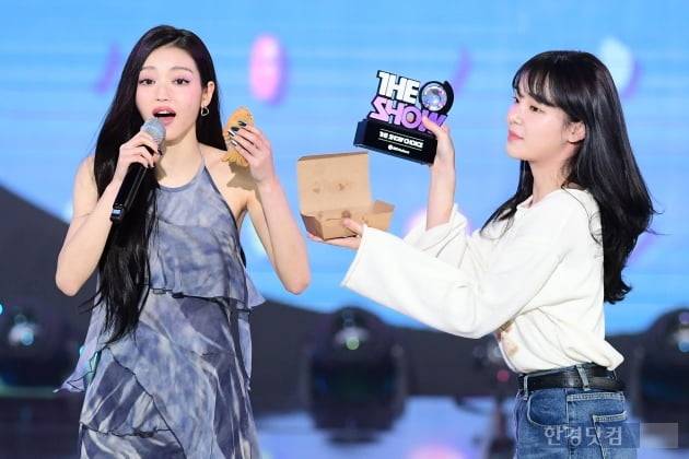 가수 유아가 22일 오후 서울 상암동 SBS 프리즘타워에서 열린 SBS M '더쇼' 현장공개에 참석해 '더쇼 초이스'를 수상한 후 공연을 펼치고 있다. 현장을 찾은 오마이걸 승희가 무대에 올라 축하해주고 있다.