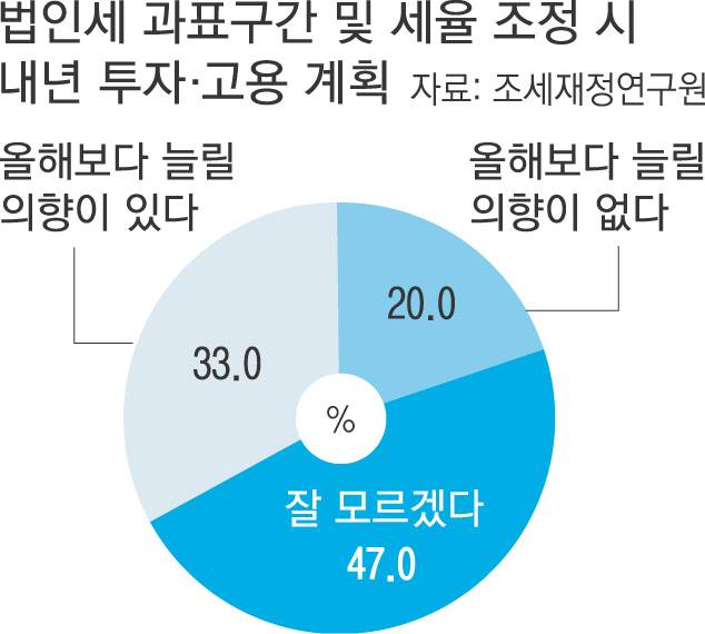 22일 국책연구원인 조세재정연구원(조세연)이 발간한 조세재정브리프(우리나라 법인세율 체계 개편 필요성 검토)를 보면 법인세 과표 구간과 세율 체계가 개선되면 내년 투자와 고용을 올해보다 확대할 의향이 있는지 묻는 설문조사에 대기업 관계자의 62.5%는 ‘잘 모르겠다’고 답했고, 8.3%는 ‘없다’고 했다. ‘늘릴 의향이 있다’고 응답한 대기업 비율은 29.2%에 그쳤다.