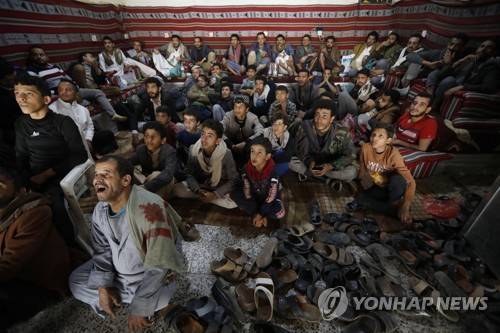 epa10320543 Yemeni soccer fans react as they watch a live broadcast of the FIFA World Cup Qatar 2022 group C soccer match between Argentina and Saudi Arabia, inside a paid-entry shop in Sana'a, Yemen, 22 November 2022. EPA/YAHYA ARHAB