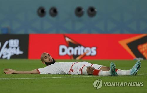epa10320554 Aissa Laidouni of Tunisia reacts during the FIFA World Cup 2022 group D soccer match between Denmark and Tunisia at Education City Stadium in Doha, Qatar, 22 November 2022. EPA/Ronald Wittek