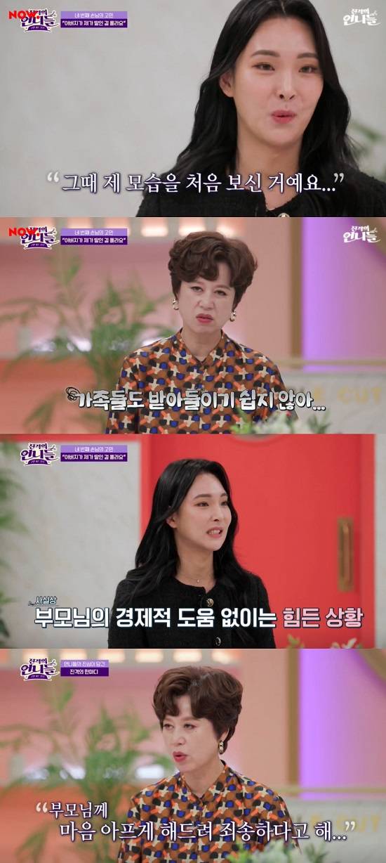 윤지는 "몇 번 (아버지께 이야기를) 시도했는데 용기가 안나더라"며 "방송으로 도움 받고 싶어 왔다. 최근 추석에 갔는데 머리와 화장을 숨긴 채 갔다"고 토로했다.