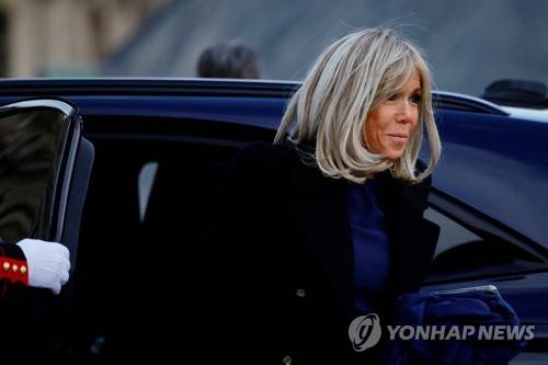 epa10320619 Brigitte Macron, wife of French President Emmanuel Macron, arrives for a visit of the exhibition 'The splendours of Uzbekistan's Oases' with Uzbek President Shavkat Mirziyoyev (not seen) at the Louvre museum in Paris, France, 22 November 2022. EPA/SARAH MEYSSONNIER / POOL MAXPPP OUT