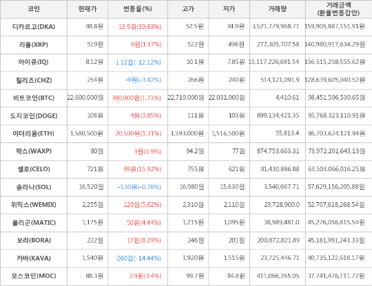 또한, 셀로(15.92%, 721원), 보라(8.29%, 222원), 위믹스(5.62%, 2,255원), 폴리곤(4.44%, 1,175원), 왁스(3.9%, 80원), 도지코인(3.85%, 108원), 모스코인(3.4%, 88.3원), 이더리움(1.31%, 1,580,500원), 리플(1.17%, 519원)이 상승세를 나타냈다.
