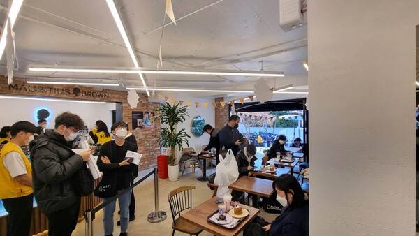 지난 10일 부산 서면에서 오픈한 블루 아카이브 콜라보 카페는 지스타 2022 대목을 맞아 수많은 게이머들로 북적였다. 블루 아카이브를 모티브로 만든 다양한 식음료를 먹을 수 있는 공간과 굿즈를 구매할 수 있는 숍이 마련되어 있다.