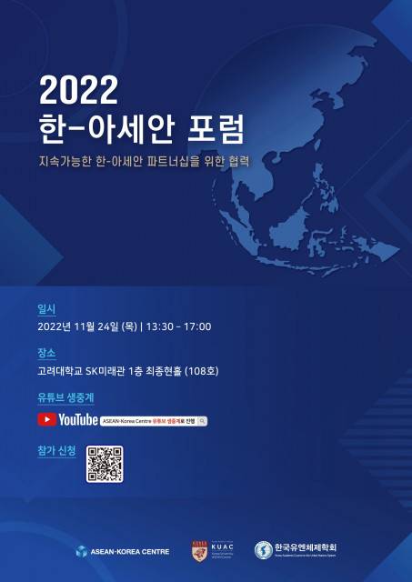 한-아세안센터(사무총장 김해용)가 11월 24일(목) 고려대학교 SK미래관 최종현홀에서 '한-아세안 포럼'을 개최한다.