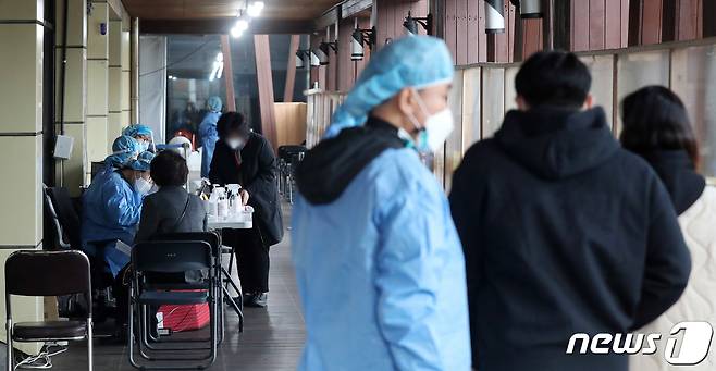 (서울=뉴스1) 민경석 기자 = 23일 오전 서울 송파구 보건소에 마련된 선별검사소에서 시민들이 진단 검사를 받기 앞서 의료진과 무답을 나누고 있다.
