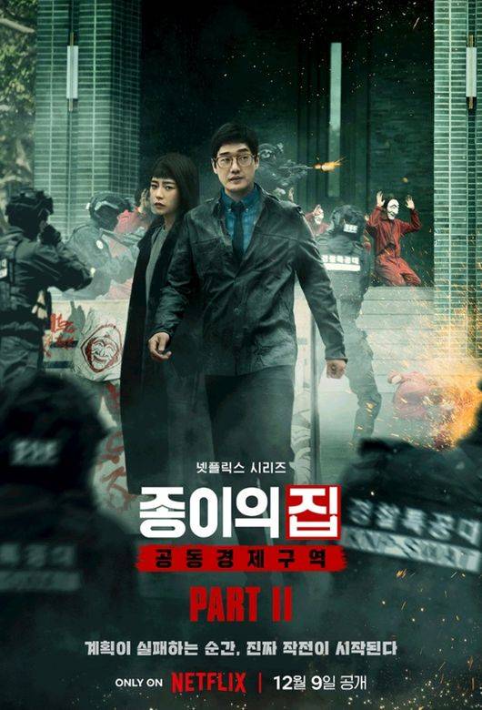 '종이의 집: 공동경제구역' 파트2가 하회탈을 쓴 천재 강도단의 피날레를 공개한다. '종이의 집: 공동경제구역'은 통일을 앞둔 한반도를 배경으로 천재적 전략가와 각기 다른 개성 및 능력을 지닌 강도들이 기상천외한 변수에 맞서며 벌이는 사상 초유의 인질 강도극을 그린 넷플릭스 시리즈다. 공개된 예고편에는 최악의 상황으로 치닫는 통일 조폐국 안팎의 모습이 담겨있다.