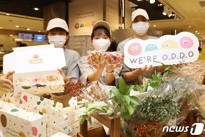 (서울=뉴스1) = 23일 서울 중구 롯데백화점 본점 디저트 팝업스토어에서 직원들이 '카페 오디디오' 상품을 소개하고 있다.