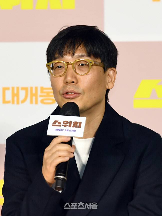 마대윤 감독이 23일 서울 광진구 롯데시네마 건대입구점에서 진행된 영화 '스위치' 제작보고회에서 사회자의 질문에 답을 하고 있다.