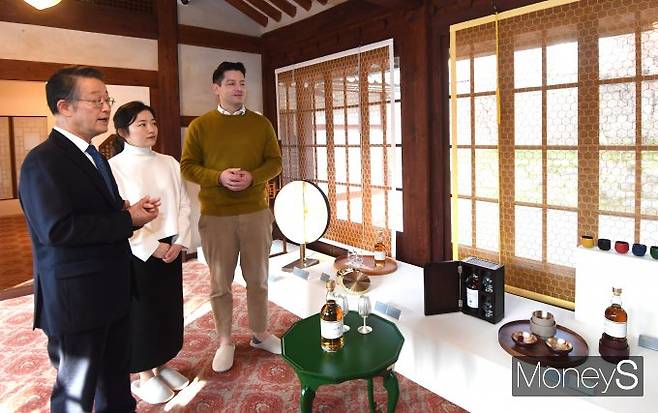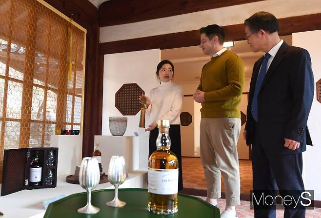 조대용 염장(국가무형문화재 114호)과 정다혜 작가(2022 로에베 재단 공예상 위너)가 23일 오전 서울 종로구 휘겸재에서 열린 발베니 메이커스 전시에서 작품을 기업인 겸 방송인 마크테토에게 소개하고 있다.