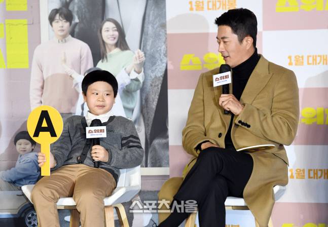 아역배우 김준(왼쪽)과 배우 권상우가 23일 서울 광진구 롯데시네마 건대입구점에서 진행된 영화 '스위치' 제작보고회에서 사회자의 질문에 답을 하고 있다.
