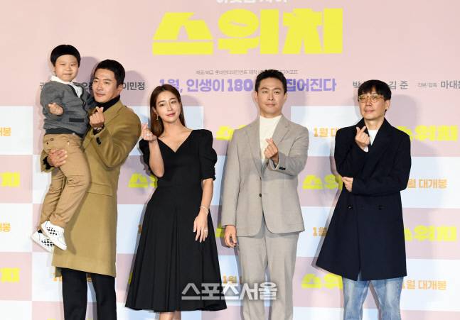23일 서울 광진구 롯데시네마 건대입구점에서 진행된 영화 ‘스위치’ 제작보고회에서 출연 배우들이 취재진을 향해 포즈를 취하고 있다. 왼쪽부터 아역배우 김준, 배우 권상우, 이민정, 오정세, 마대윤 감독.