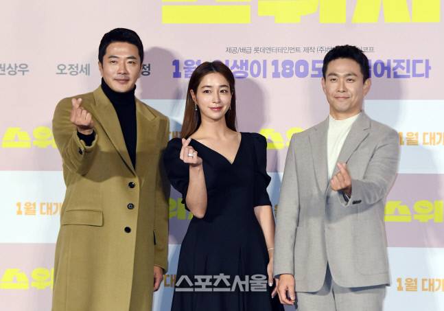 배우 권상우(왼쪽)와 이민정(가운데), 오정세가 23일 서울 광진구 롯데시네마 건대입구점에서 진행된 영화 ‘스위치’ 제작보고회에서 취재진을 향해 포즈를 취하고 있다.