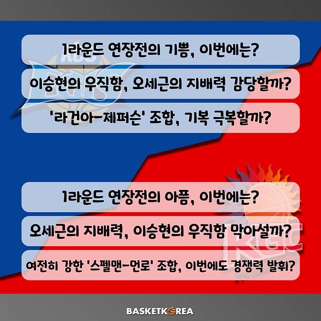 안양 KGC의 키 포인트는 1라운드 연장전 아픔을 극복하는 것이다. 스펠맨-먼로 조합이 경쟁력을 발휘해야하고, 오세근의 지배력이 이승현의 우직함을 막아낼지도 관심사이다.