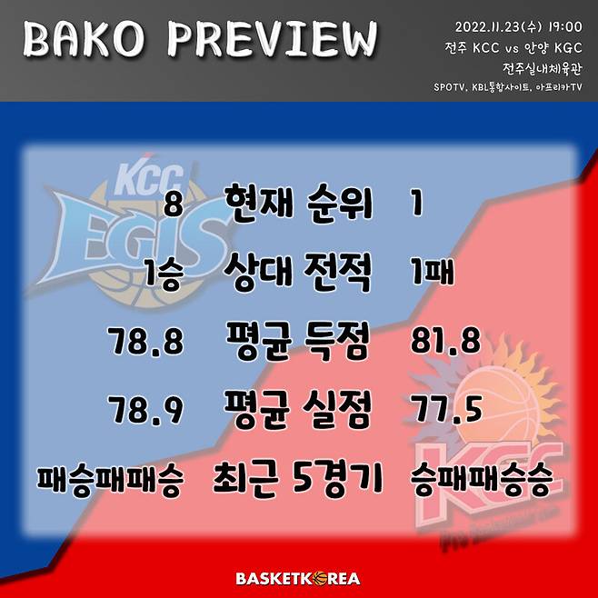 [BAKO PREVIEW] 2022.11.23 전주 KCC vs 안양 KGC