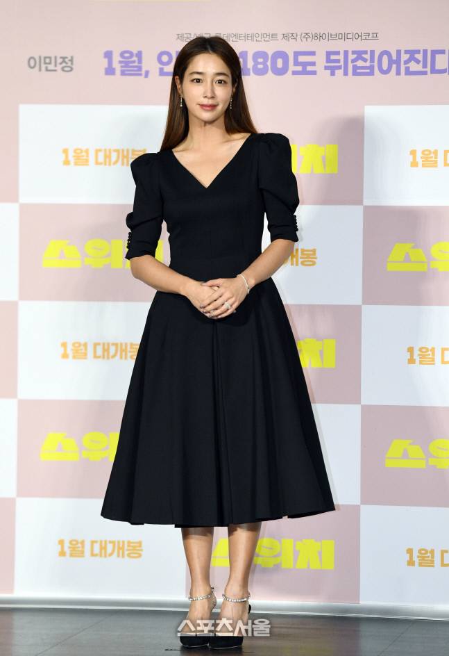 배우 이민정이 23일 서울 광진구 롯데시네마 건대입구점에서 진행된 영화 ‘스위치’ 제작보고회에서 취재진을 향해 포즈를 취하고 있다.