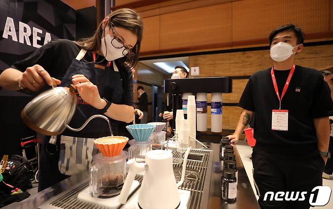 (서울=뉴스1) 김진환 기자 = 23일 오후 서울 강남구 코엑스에서 열린 제21회 서울카페쇼에서 한 외국인 바리스타가 필터 커피기구를 시연하고 있다.