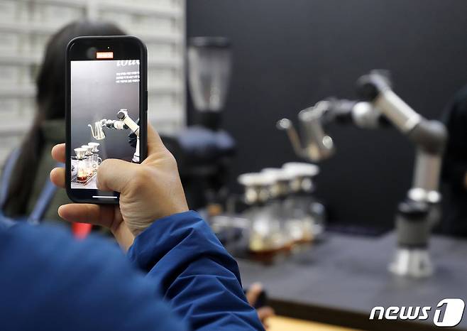 (서울=뉴스1) 김진환 기자 = 23일 오후 서울 강남구 코엑스에서 열린 제21회 서울카페쇼에서 한 관람객이 커피를 제조하는 로봇을 스마트폰으로 촬영하고 있다.