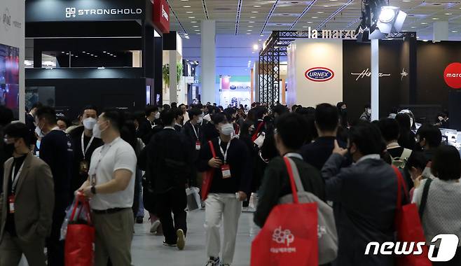 (서울=뉴스1) 김진환 기자 = 23일 오후 서울 강남구 코엑스에서 열린 제21회 서울카페쇼에서 관람객들이 다양한 커피 제품을 살펴보고 있다.