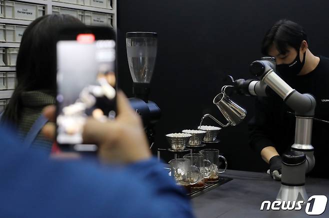 (서울=뉴스1) 김진환 기자 = 23일 오후 서울 강남구 코엑스에서 열린 제21회 서울카페쇼에서 한 관람객이 커피를 제조하는 로봇을 스마트폰으로 촬영하고 있다.