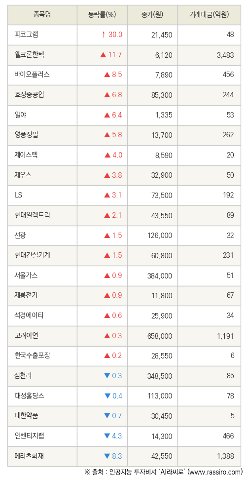 특히 피코그램은 전 거래일 대비 30.0% 오른 21,450원에 거래를 마감하여 높은 관심을 받았다.