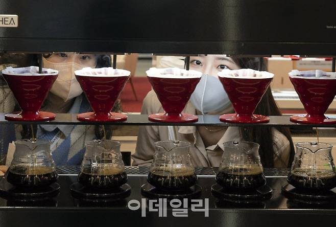 [이데일리 김태형 기자] 23일 서울 삼성동 코엑스에서 열린 서울카페쇼에서 관람객들이 커피머신을 통해 로봇이 커피를 내리는 모습을 살펴보고 있다.