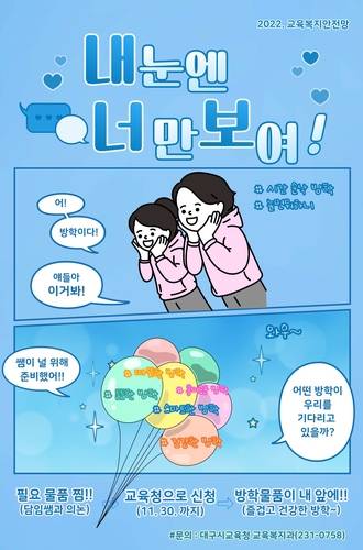 대구시교육청(교육감 강은희)은 교육복지안전망의 일환으로 방학 중 도움이 필요한 고등학생을 대상으로 '내 눈엔 너만 보여' 사업을 운영한다.