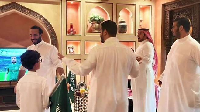 빈 살만이 공개한 사진을 보면, 가족들은 소파에 앉지도 못하고 텔레비전 앞에 옹기종기 모여 사우디를 응원했습니다.