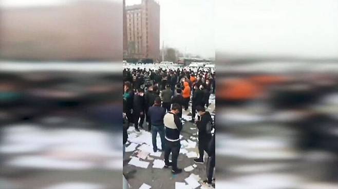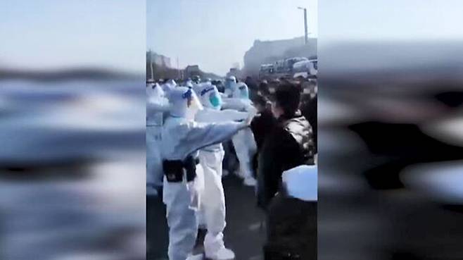 중국 현지 SNS에는 폭스콘 공장에서 수백 노동자들이 기숙사에서 쏟아져 나와 방역 요원들과 대치하는 영상이 퍼지고 있습니다.