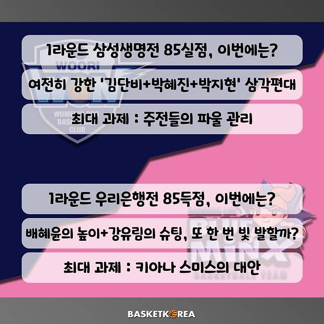 오늘 경기 우리은행의 키 포인트는 김단비-박혜진-박지현의 강한 삼각편대이다. 최대 과제는 주전선수들의 파울 관리이다.
