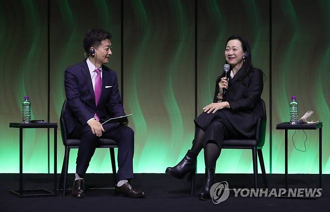 (부천=연합뉴스) 윤태현 기자 = 소설 '파친코'를 쓴 이민진 작가(오른쪽)가 23일 오후 경기도 부천시 부천아트센터에서 열린 작가와의 만남 행사에서 독자 질의에 답변하고 있다. 2022.11.23