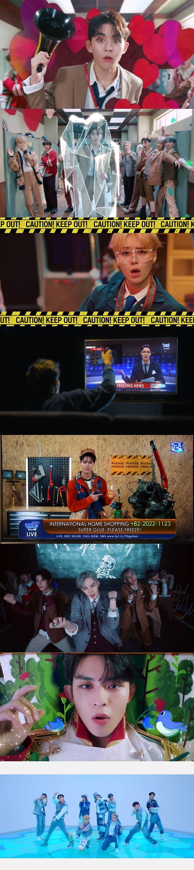 메가폰을 들고 있는 동건의 모습으로 시작한 뮤직비디오는 자유분방하고 에너지 넘치는 멤버들의 다채로운 매력이 담겼다. 상대에게 첫눈에 반해 몸이 얼음처럼 굳어버린 모습부터 앵커, 왕자 캐릭터로 변신한 멤버들의 연기까지 아기자기한 연출이 돋보인다. 여기에 ‘얼음 땡’ 놀이를 하듯 멈췄다가 움직이는 안무로 유쾌한 분위기를 더했다.