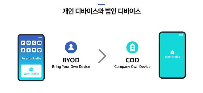 먼저 업무에 사용되는 개인 디바이스는 '개인정보' 이슈와 연관될 수밖에 없다. 스마트워크 시대가 도래하면서 기업은 개인용컴퓨터(PC)뿐만 아니라 모바일에서도 보안을 구축해야만 한다. 그러나 개인 디바이스를 업무 용도로 사용하는 BYOD(Bring Your Own Device) 방식에서는 과도한 개인정보 권한 요구로 임직원의 불평을 야기할 수밖에 없다. 이에 따라 기업들도 MDM(모바일 디바이스 관리) 솔루션을 도입하는 경우 BYOD 방식이 아닌 COD(Company Own Device) 방식으로 변경하고 있다.