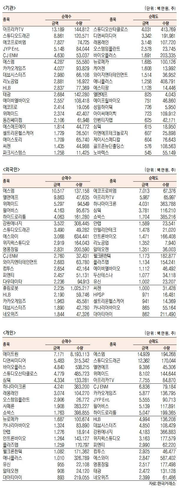 [데이터로 보는 증시]코스닥 기관·외국인·개인 순매수·순매도 상위종목(11월 23일-최종치)