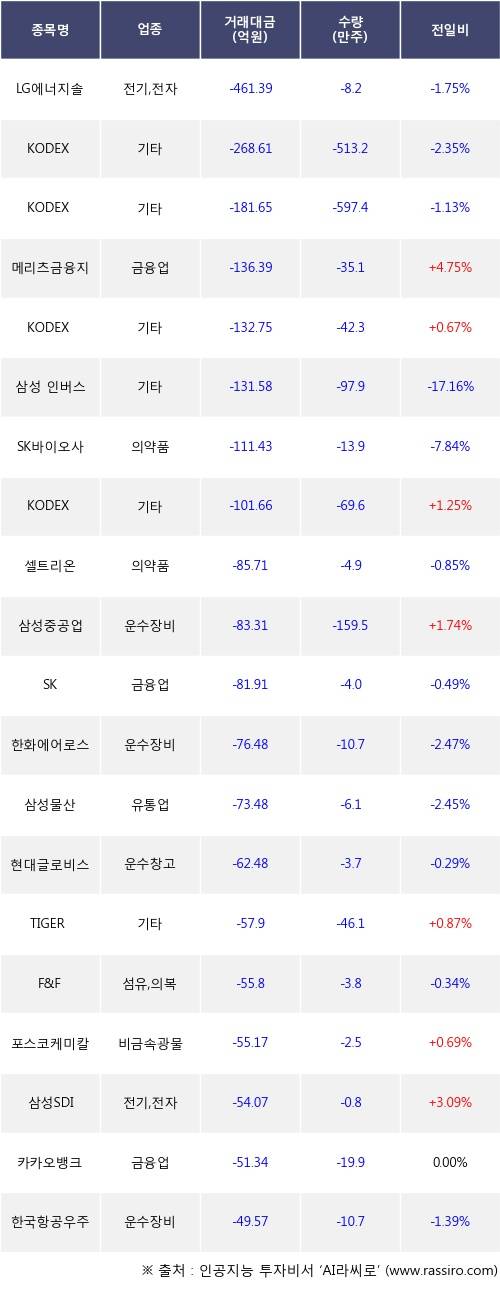 기관 투자자의 순매도 상위 20개 종목은 LG에너지솔루션, KODEX 코스닥150선물인버스, KODEX 200선물인버스2X, 메리츠금융지주, KODEX 200, 삼성 인버스 2X 천연가스 선물 ETN C, SK바이오사이언스, KODEX 미국나스닥100선물(H), 셀트리온, 삼성중공업등이다.