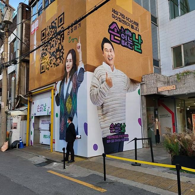 공개된 사진 속에는 배우 한가인-연정훈 부부의 자녀들이 서울 성동구 성수동에 설치된 JTBC '손 없는 날' 랩핑 광고를 바라보는 모습이 담겨 있다. 특히 MC 한가인과 신동엽의 초대형 사진이 시선을 사로잡는다.