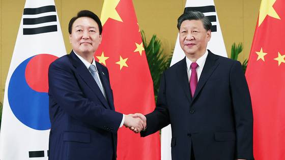 President Yoon Suk-yeol shakes hands with Chinese President Xi Jinping, Nov. 15, before a summit at a hotel in Bali, Indonesia during the G20 Summit. [YONHAP]
