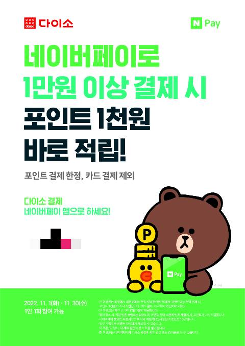 균일가 생활용품점 ㈜아성다이소가 '네이버페이 이벤트'를 11월 한달간 진행한다. 다이소 매장에서 '네이버페이 포인트'로 1만 원 이상 결제 시, '네이버페이 포인트' 1천원을 즉시 적립해준다. 결제 완료 후 포인트 뽑기 추가 혜택도 제공된다.