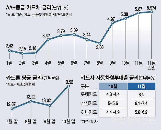카드사들이 최근 몇년간 공격적으로 영업을 확대해왔던 자동차 금융에서도 마찬가지다. 롯데카드는 이달들어 오토할부 금리를 연 8.3~8.5%(24~60개월 할부 기준)로 인상했다. 롯데카드의 오토할부 금리는 지난 7월만 해도 연 2~3%대였지만, 넉달만에 연 8%대로 4배 가까이 올랐다. 다른 카드사들도 이달부터 오토할부 금리를 1%포인트 안팎 인상했다. 삼성카드 오토할부 금리는 연 5~5.7%에서 연 6.1~6.5%로, 하나카드는 연 4.4~4.9%에서 연 5.4~5.9%로 높아졌다. 국민카드는 특별 금리 최저 수준을 연 5.4%에서 연 6.1%로 인상했다.