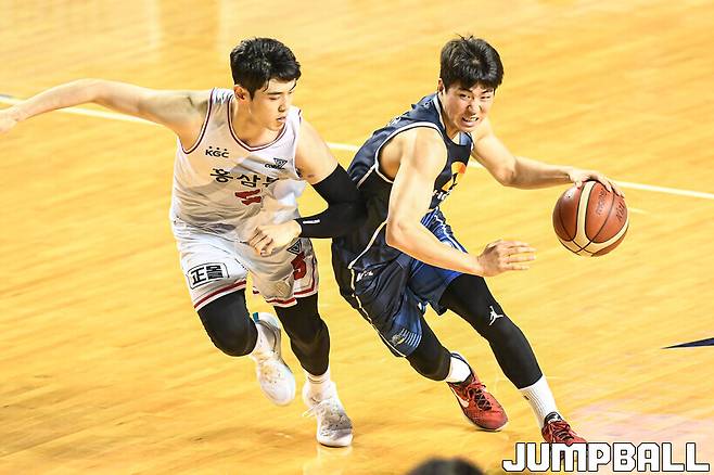23일 전주실내체육관에서 열린 2022-2023 SKT 에이닷 프로농구 전주 KCC와 안양 KGC인삼공사의 경기, KCC 김지완이 돌파를 시도하고 있다.