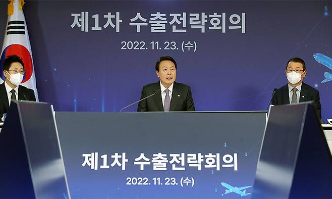 윤 대통령은 회의 모두발언에서 “수출은 오늘날의 한국경제를 만들어낸, 국민 일자리의 원천”이라며 “각 기업이 수출 수주 과정에서 겪는 애로 사항과 정부가 무엇을 해줘야 하는지를 찾아내서 바로바로 해결해나가야 한다”고 당부했다. 정부는 먼저 현장 목소리에 귀를 기울여 정책에 적극 반영해야 소기의 성과를 거둘 수 있음을 명심해야 한다. 우리 경제의 활로를 찾으려면 마땅히 해야 할 일이다. 국회에서도 여야가 반도체산업 지원 특별법인 ‘K-칩스법’ 등의 처리를 서둘러 수출하기 좋은 환경을 조성하는 데 힘을 보태야 할 것이다.