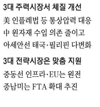 중남미 시장 개척을 위해서는 멕시코·에콰도르 등 주요국과 자유무역협정(FTA)을 새롭게 체결하고 칠레 등과는 FTA 고도화를 추진할 예정이다. EU에서는 폴란드 원전 협력을 계기로 유럽 원전 및 원전기자재 수출 확대를 공략하기로 했다. 러시아·우크라이나 전쟁 장기화를 고려해 방산 사업과 친환경 사업 등도 공략할 예정이다.