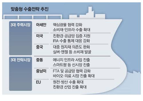 이번 수출전략회의에서 제시된 수출 강화 방안의 핵심은 '맞춤형 전략'이다. 정부는 수출 시장을 크게 △3대 주력시장 △3대 전략시장 두 갈래로 나눠 특화전략을 구성했다. 3대 주력시장으로는 미국·중국·아세안을 꼽았다. 이들은 한국 수출의 57%를 차지한다. 미국을 상대로는 친환경·공급망 분야의 대규모 프로젝트에 참여할 기회를 모색할 계획이다. 인플레이션 감축법(IRA)과 대중(對中) 반도체 수출 통제, 인도태평양경제프레임워크(IPEF) 등 통상 현안에도 선제적으로 대응하기로 했다. 중국의 경우 원자재 수입 의존도가 갈수록 심화되고 있다고 보고 의존도를 낮추는 데 중점을 두기로 했다. 비축·수입처 다변화 등을 통해 공급망을 안정화하는 데 지원을 확대한다는 구상이다. 베트남 편중이 심한 아세안 시장도 인도네시아나 태국 등으로 다변화할 계획이다. 인도네시아·필리핀 등 자원이 많은 국가와는 핵심광물 협력을 강화키로 했다.