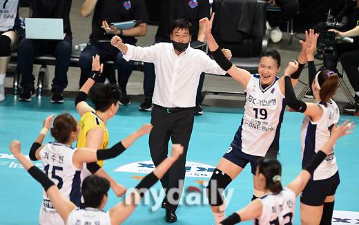 [마이데일리 = 유진형 기자] IBK기업은행 김호철 감독이 23일 오후 서울 장충체육관에서 진행된 '2022-2023 도드람 V리그' 여자부, GS칼텍스와 IBK기업은행의 경기에서 기뻐하고 있다.