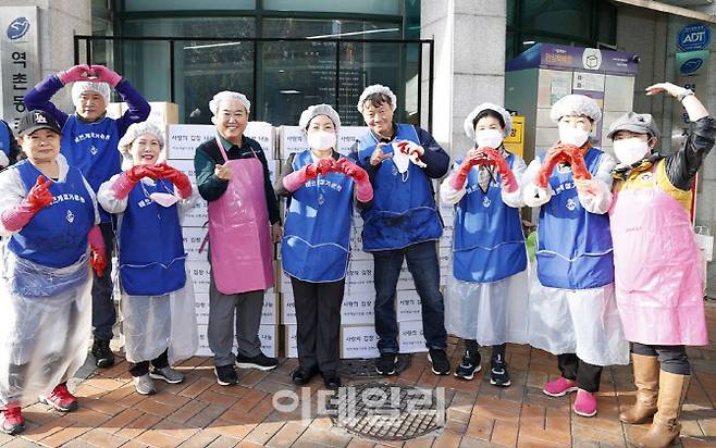 [이데일리 김태형 기자] 김미경(가운데) 은평구청장이 23일 김장철을 맞아 역촌동주민센터 앞에서 ‘따뜻한 김장 나눔 행사’를 진행했다.