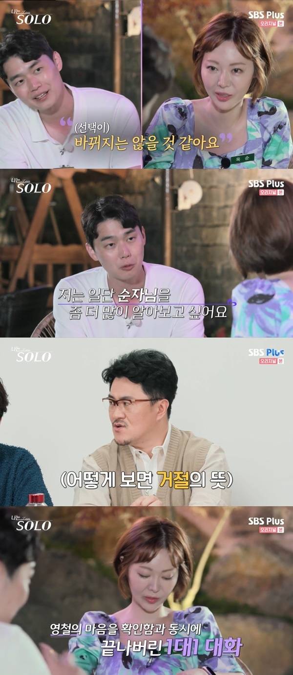 이에 영철은 “(옥순이) 충분히 엄청 매력적이신데 바뀌지는 않을 것 같다. 한 사람 알기에도 시간이 짧다. 순자님을 좀 더 알아보고 싶다”고 단도직입적으로 말했다. 데프콘은 “어떻게 보면 거절이다”며 영철의 철벽에 놀랐다. (사진=ENA PLAY, SBS Plus ‘나는 SOLO’ 캡처)