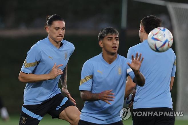 (도하=연합뉴스) 김주성 기자 = 2022 카타르 월드컵 조별리그 1차전 상대인 우루과이 대표팀의 다르윈 누녜스(맨 왼쪽) 등 선수들이 23일(현지시간) 카타르 도하의 알에르살 훈련장에서 공개훈련을 하고 있다. 2022.11.23