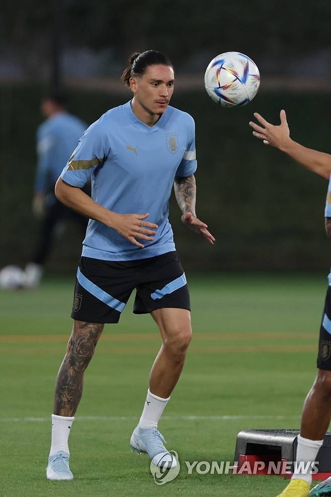 (도하=연합뉴스) 김주성 기자 = 2022 카타르 월드컵 조별리그 1차전 상대인 우루과이 대표팀의 다르윈 누녜스가 23일(현지시간) 카타르 도하의 알에르살 훈련장에서 공개훈련을 하고 있다. 2022.11.23